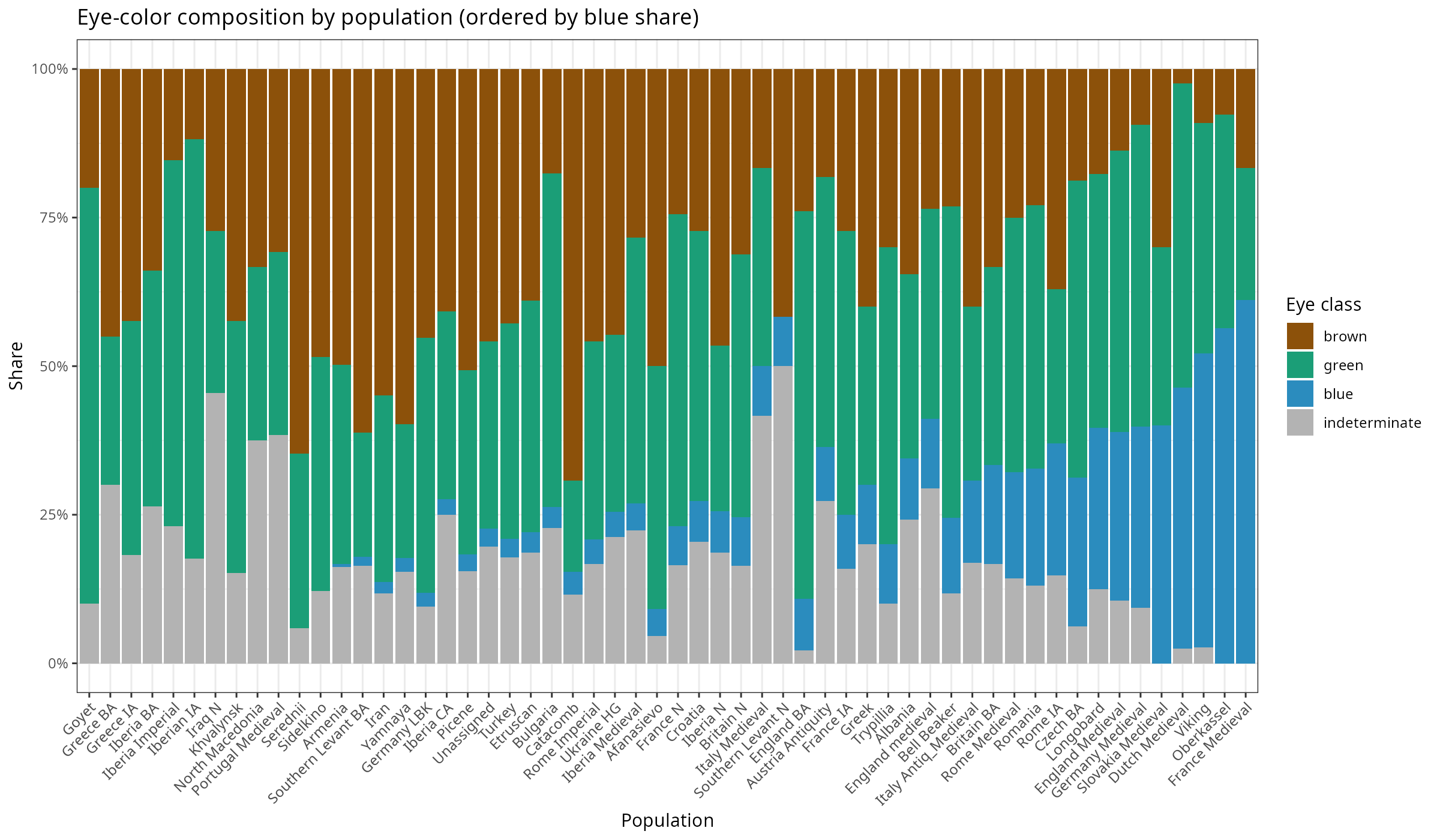 For example, the graph below is supposed to show that blue eyes only became popular during the last 500 years under the influence of freak mutant Vikings. It’s just that the “undetermined” category disappears right when blue eyes appear on the timeline.