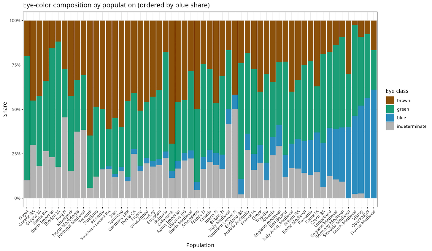 Clearly, human blue eyes come from such low-light, cold forest conditions. But perhaps not from the steppe pastoralists of Southern Russia. It may be so that the invading “Aryans” didn’t have blue eyes. But there’s a problem: Genetics studies apparently can’t identify large populations of ancient Western Hunter Gatherers, or other Europeans, with blue eyes!