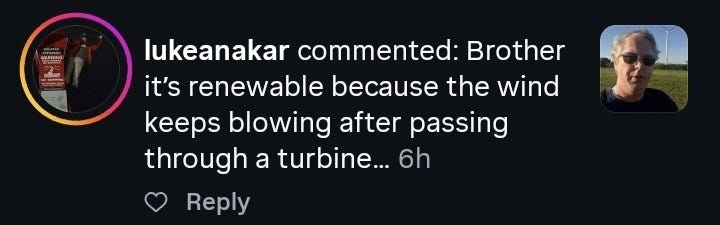 The wind energy you’ve absorbed is now gone. Yet, fully grown human beings seem to miss this part of the equation. They think the wind just “blows through” the turbine, as though wind can blow against a wall and come out the other side.