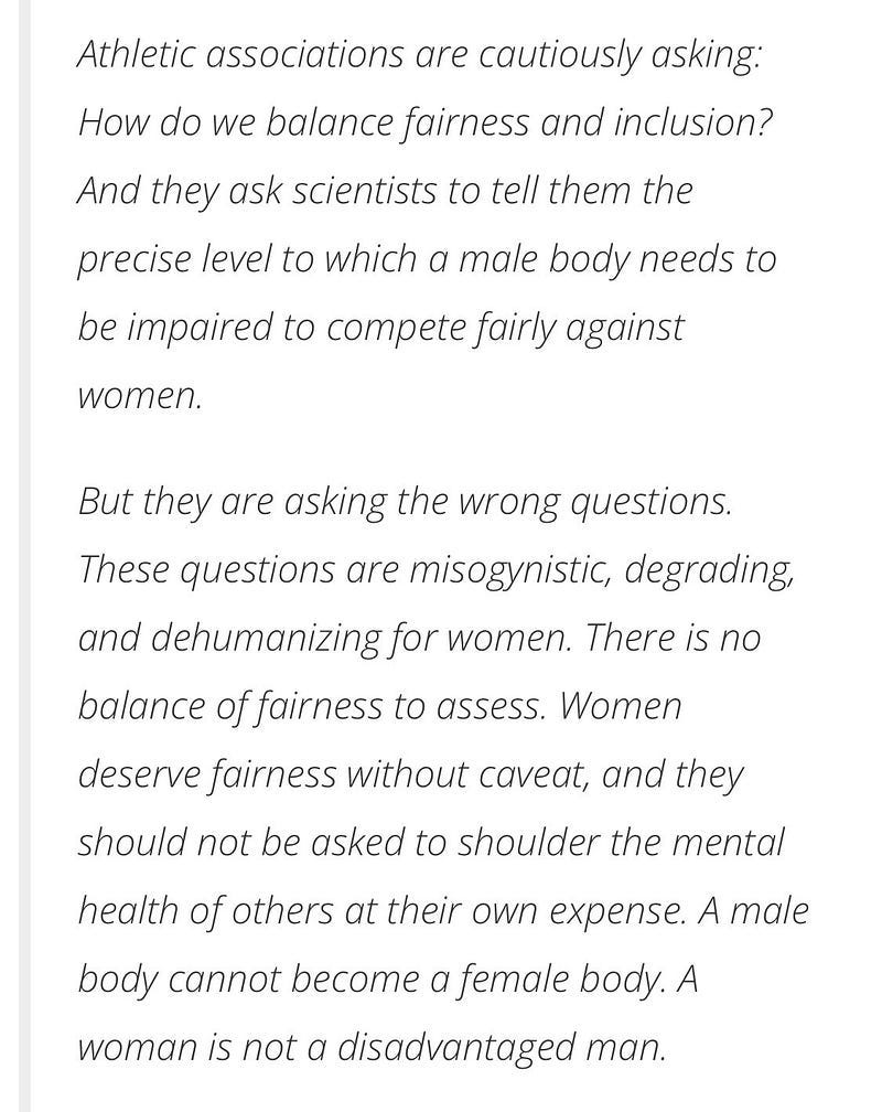 But what struck me was the twist that followed. Though the public agrees that people born male should not be allowed to compete against biological women, sports officials and scientists worried a lot more about “inclusion”, and about how women ought to shoulder the mental health issues of transwomen (born men).