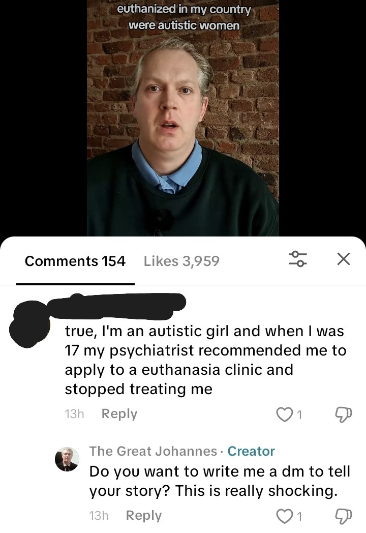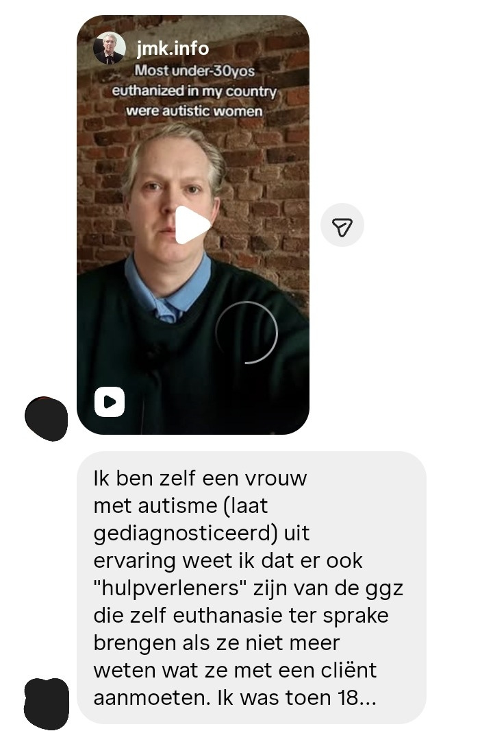 Within 24 hours after my video about euthanasia for young autistic women, two women informed me that they were indeed told to "get euthanized", at ages 17 and 18.