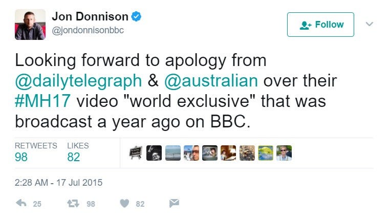 Jon Donnison, “Looking Forward to Apology from @dailytelegraph & @australian over Their #MH17 Video ‘world Exclusive’ that Was Broadcast a Year Ago on BBC.,” microblog, @jondonnisonbbc, (July 17, 2015).